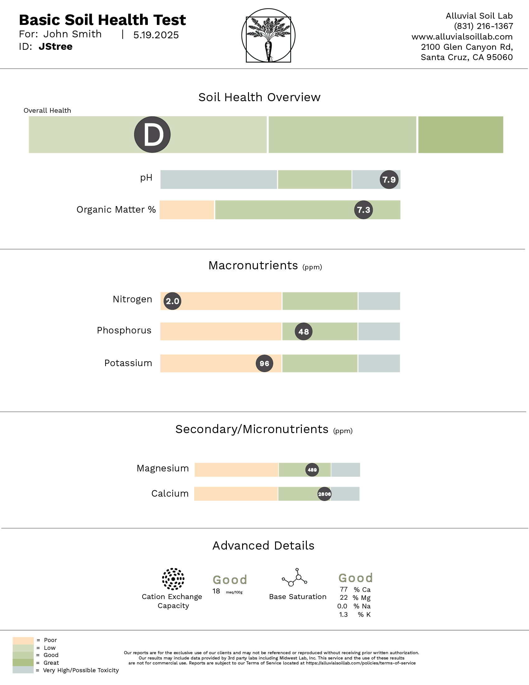 We do not recommend the Basic Soil Health Test if you're testing your soil for the first time—the Full Chemistry Test offers a much more comprehensive analysis of common deficiencies and toxicities like sodium, boron, copper, sulfur, manganese, TDS, etc.